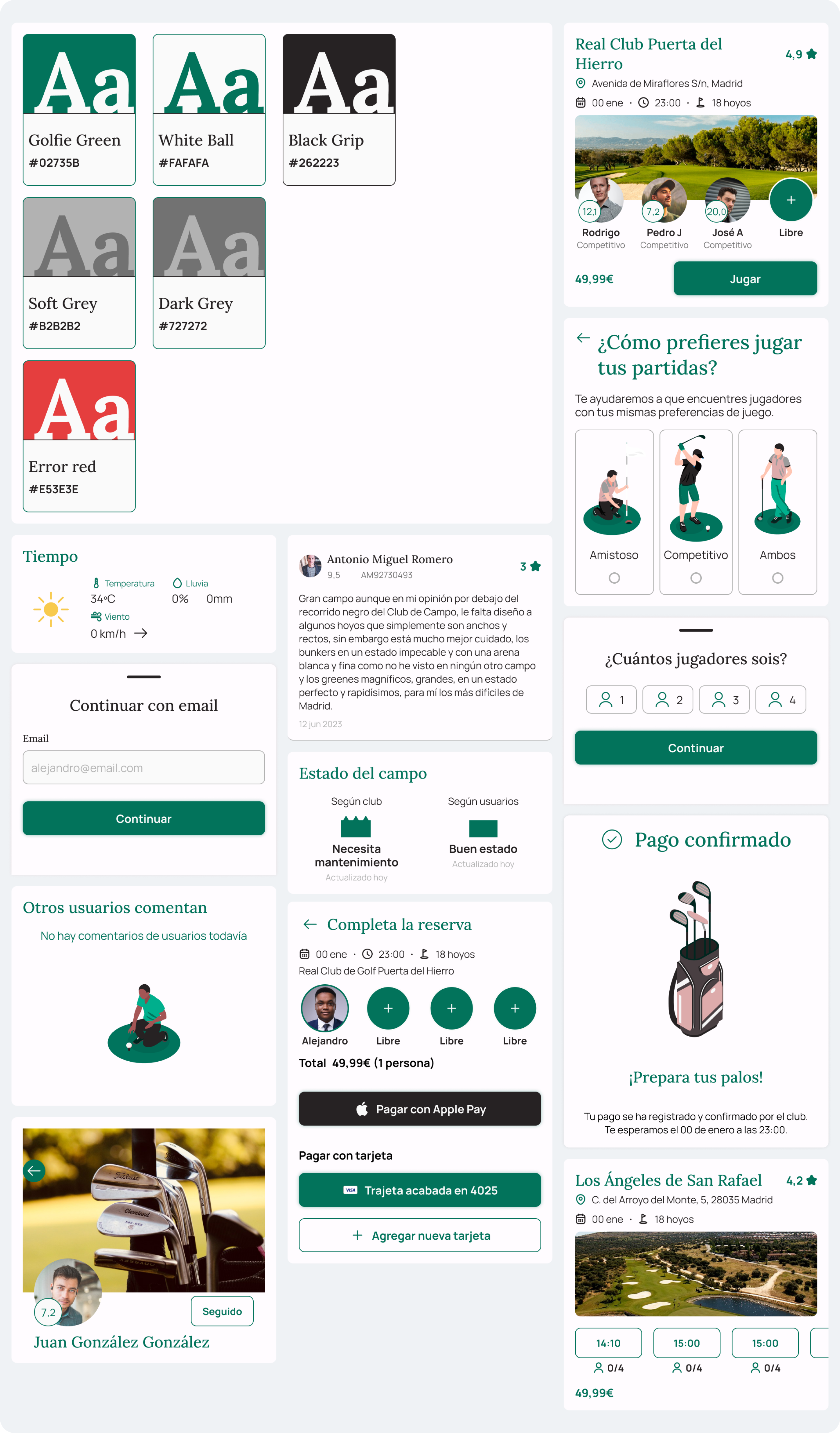 We conceptualized the brand using core elements of golf: greens, white, and black as primary colors, complemented by action-oriented images to make the experience more dynamic. In the UI, we opted for a minimalist design to enhance usability and make the app feel approachable and intuitive.